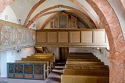 Johann Hartmann Bernhard baute im Jahr 1833 eine neue Orgel mit zehn Registern auf einem Manual und Pedal – gemäß Aufschrift am Spieltisch seine 33. Orgel. Der flache Prospekt ist in fünf Felder gegliedert und passt sich dem Gewölbe an. Im Jahr 1891 tauschte Johann Georg Förster die Quinte 3′ durch ein Salicional 8′ aus und baute ein neues Gebläse für insgesamt 506 Mark ein.[12] Ansonsten war die Orgel offensichtlich bis zum Jahr 2001 unverändert erhalten. Anlässlich der Renovierung der Kirche in den Jahren 2001/2002 wurde auch die Orgel ausgebaut. Im Rahmen des anschließenden Wiedereinbaus wurden offensichtlich von der ausführenden Werkstatt Änderungen vorgenommen:[13] Die Quinte 3′ wurde wiederhergestellt, allerdings als „Naßart“ und statt der Flöte 8′ findet sich seitdem ein Sifflet 1′ in der Orgel. Die aktuelle Disposition der Denkmalorgel lautet wie folgt:[14]