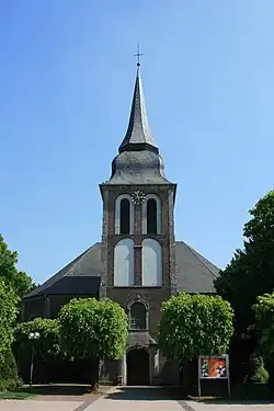 Die Kirche ist ein querrechteckiger Saalbau mit breit abgeschrägten Ecken. Die Pläne stammen von dem Maastrichter Baumeister François Soiron, einem Bruder von Matthieu Soiron. Der mittig vorgesetzte Westturm entspricht einer flachen Kanzelnische an der Rückseite. Dahinter befindet sich eine kleine Sakristei. Das Backsteinmauerwerk steht auf einen Quadersockel. Ein verschiefertes Walmdach überdeckt den Bau. Eine geschweifte Turmhaube mit aufgesetzter hoher Helmpyramide, ebenfalls verschiefert, eine Wetterfahne und die Gestalt eines Posaunenengels schließen den Turm ab.