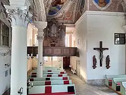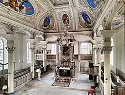 Der alte Chorturm wurde unter Beibehaltung des Erbbegräbnisses in seinem Untergeschoss bei der Kirchenvergrößerung von 1696 in das Kirchenschiff einbezogen. Der Kirchenraum, der durch die eingezogenen Säulen eine dreischiffige Anmutung hat, ist überspannt von einer prachtvoll ausgemalten Stuckdecke mit dogmatischen und Passionsmotiven.