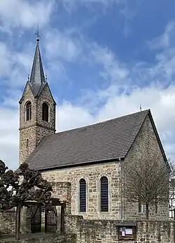 Die steinsichtige Saalkirche wurde 1801 im Rundbogenstil gebaut. Der Kirchturm im Westen wurde 1880 nach einem Brand erneuert. In seinem obersten Geschoss befindet sich hinter den Klangarkaden der Glockenstuhl. Bedeckt ist der Turm mit einem achtseitigen, spitzen, schiefergedeckten Helm. Das mit einem Tympanon bekrönte Portal befindet sich an der Südseite des mit einem Satteldach bedeckten Kirchenschiffs.