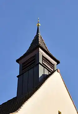 Der Dachreiter fasst eine kleine g′′-Glocke aus Bronze, die 1952 von der Glockengießerei Bachert gegossen wurde. Die Orgel aus dem Jahr 1967 besitzt ein Manual, ein angehängtes Pedal und vier Register.[3] Das Instrument wurde nach 2016 auf die gegenüberliegende Seite der Orgelempore versetzt.[7]
