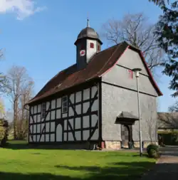 Die Fachwerkkirche in Ständerbauweise wurde 1669–73 gebaut. Ihre Wände sind zum Teil verschiefert. Aus dem Krüppelwalmdach des Kirchenschiffs erhebt sich ein sechseckiger, schiefergedeckter, mit einer glockenförmigen Haube bedeckter Dachreiter, der die Turmuhr und hinter den Klangarkaden den Glockenstuhl beherbergt. Der Innenraum ist mit einer Flachdecke überspannt, die längst auf einem Unterzug ruht, der in der Mitte von einer Stütze und dem freistehenden hölzernen Chorbogen getragen wird. Die Emporen wurden 1729 eingebaut.