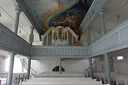 Das tonnengewölbte Erdgeschoss des Turmes ist nur vom Kirchenschiff aus zugänglich. Die dreiseitig umlaufenden Emporen entstanden um 1900. Das Kirchenschiff wird durch den Haupteingang auf der Südseite betreten.