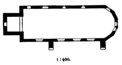 Die Kirche ist ein kleiner Saalbau mit polygonalem Schluss und Westturm. Das Innere überdeckt eine gewölbte Holzdecke.