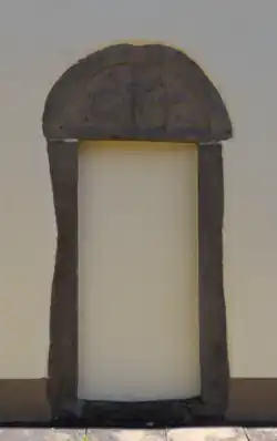 Von der ursprünglichen Kirche, die um 1600 verändert wurde, haben sich der Chorbogen innen sowie das über dem rechteckigen Westportal eingemauerte Tympanon erhalten. Auf dem halbkreisförmigen Tympanonfeld ist als Flachrelief Christus am Kreuz sowie links eine Scheibe (als Symbol der Sonne oder Erde) und rechts ein Kreuz zu sehen.