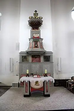 Die hölzerne, polygonale Kanzel aus dem späten 18. Jahrhundert ist auf einer Kanzelwand vor der Turmhalle angebracht. Die Kanzelwand hat im unteren Drittel hochrechteckige Füllungen, in der Mitte durchbrochenes Rautenwerk und oben Verglasungen. Der Kanzelkorb hat konkave Felder mit trapezförmigen Füllungen, eine Rückwand mit Füllungen vermittelt zum Schalldeckel, der an der Unterseite von einem achtstrahligen Stern verziert wird und von einer teils vergoldeten Volutenkrone und Rankenwerk bekrönt wird. Vor der Kanzel steht der Altartisch. Die Ostempore dient als Aufstellungsort für die Orgel.[1] Das Kirchengestühl ist von drei Seiten auf die Kanzel und den Altar ausgerichtet. Die Brüstung des Gestühls hat querrechteckige Füllungen. In der Sakristei ist eine spätgotische Truhe erhalten.[8]
