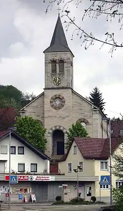 Die Saalkirche aus Quadermauerwerk im Rundbogenstil wurde 1843/44 nach einem Entwurf von Gottlob Georg Barth errichtet und später entstellend umgebaut. Sie besteht aus einem Langhaus und einem Fassadenturm im Süden, der halb in das Langhaus eingestellt ist. Sein oberstes Geschoss enthält die Turmuhr und den Glockenstuhl mit drei Kirchenglocken. Darauf sitzt ein achtseitiger Knickhelm. Das Portal befindet sich hinter einer offenen Vorhalle im Süden.
