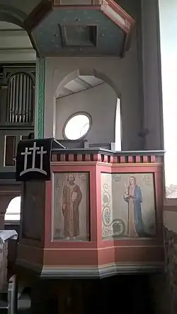 In das Schiff ist eine dreiseitig umlaufende Empore eingebaut, deren spätbarocke, ungewöhnliche Brüstungsmalereien wahrscheinlich aus der Zeit nach 1763,[13] nach anderer Auffassung aus dem 17. Jahrhundert stammen.[3] Sie zeigen Blattwerk- und Wurzelornamente in blauer und gelber Fassung auf rotem Grund. Der Altar datiert von 1831, die Mensaplatte allerdings aus romanischer Zeit.[17] Das Kirchengestühl wurde 1911 erneuert und in den 1950er Jahren ersetzt. Die hölzerne Kanzel mit Schalldeckel ist am südlichen Stützpfosten des Triumphbogens angebracht.[9] Die Kanzelfelder zeigen die vier Evangelisten.