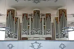 Im Jahr 1910 erbaute die Firma Orgelbau Th. Kuhn, Männedorf eine pneumatische Orgel mit 21 klingenden Registern. 1923–1924 wurde das Instrument umgebaut, es blieb bis 1968 bestehen. Im Jahr 1970 schuf wiederum die Firma Kuhn das heutige Instrument, welches erneut auf der hufeisenförmigen Westempore errichtet wurde. Das Gehäuse folgt der Farbgebung des Kirchenraumes und ist in Weiss gehalten. Zwei freistehende Pedaltürme flankieren den Hauptprospekt der Orgel. 1992 erfolgte eine Revision durch Markus Wagenbach (Firma Kuhn). Hierbei wurde die Gemsquinte von 1 1⁄3 auf 2 2⁄3 gesetzt und die Terznone wurde zur Terz 1 3⁄5 umgebaut; vom Rauschbass im Pedal wurde der höchste Chor stillgelegt.[16][17] 2017 wurde wiederum eine Revision vorgenommen, durch Uwe Schacht von Fa. Kuhn, unter Mitarbeit des örtlichen Organisten. Hierbei wurden von den Mixturen in Haupt- und Oberwerk je der höchste Chor stillgelegt und die Temperierung nach Vallotti vollzogen.[18]