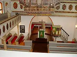 Die schalldeckellose Kanzel mit Rückwand und geschweiften Füllungen auf der Brüstung ist aus der 2. Hälfte des 18. Jahrhunderts. Die hölzerne West-, Nord- und Ost-Empore sind im Stil der Kanzel gestaltet. Das Kirchengestühl ist ebenfalls aus der Erbauungszeit des Langhauses.[2][4]