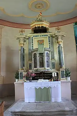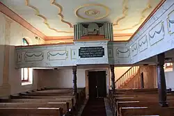 Der Innenraum der Kirche hat eine Flachdecke mit Stuckrippen aus der Erbauungszeit. Die zweiseitige, gewinkelte Holzempore ist längs der nördlichen Langhauswand vorgezogen und ruht auf hölzernen Balustersäulen. Der Innenraumabschluss im Osten ist rund ausgeführt und wird von dem aus dem Jahr 1780 stammenden Kanzelaltar dominiert. In den Brüstungsfeldern der Kanzel befinden sich gemalte Darstellungen des Salvator Mundi und der vier Evangelisten. Der Schalldeckel wird von einem Agnus Dei gekrönt.