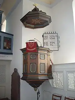 Die hölzerne, polygonale Kanzel an der Südseite stammt aus dem letzten Drittel des 18. Jahrhunderts und ist aus dem angeschlossenen hölzernen Pfarrstuhl zugänglich, der im oberen Teil durchbrochenes Rautenwerk aufweist. Die Kanzelfelder haben rechteckige Füllungen und oben und unten profilierte Gesimskränze. Der achteckige Schalldeckel wird an der Unterseite mit einer achtstrahligen Sonne aus hellem und dunklem Holz verziert und mit einer vergoldeten Taube bekrönt. Gegenüber an der Nordseite ist ein weiterer Stand mit durchbrochenem Rautenwerk aufgestellt. Die weiße Fassung ist an einer Füllung der Tür freigelegt und zeigt kreisförmiges Rankenwerk mit Blüten. Der schlichte Blockaltar ist holzsichtig und trägt ein hölzernes Kruzifix des Dreinageltypus. Im Altarbereich sind drei Grabplatten aus rotem Sandstein aufgestellt. Der achtseitige, neugotische Taufstein von 1876 auf achtseitigem, profiliertem Fuß zeigt im oberen Teil Dreipasse.[1]