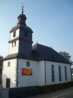 Die geostete Kirche ist an der Hauptkreuzung am westlichen Ortsrand errichtet. Von der alten Kirchhofmauer sind Reste erhalten.[1]