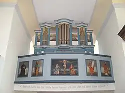 Im Norden und Westen ist eine Winkelempore aus der Erbauungszeit eingebaut, die auf mächtigen viereckigen Pfosten ruht. Die Emporenbrüstung hat Malereien von F. Pauli mit Darstellungen von Jesus, den zwölf Aposteln und den vier Evangelisten. Die Orgelempore zeigt zentral die Kreuzigungsszene, flankiert von Paulus und Luther sowie Mose und Aaron.[10]