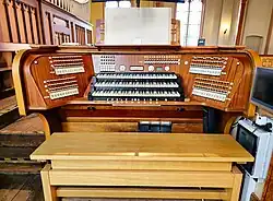- Spielhilfen: drei freie Kombinationen, feste Kombinationen, Tutti, Registercrescendotritt, Einzelabsteller, Setzeranlage (2012)