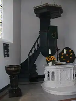 Der Taufstein wurde 1862 aus schwarzem Marmor gefertigt. Er trägt die Inschrift: Gehet hin in alle Welt und tauffet alle Völcker in dem Namen Gottes des Vatters, Gottes des Sohns und Gottes des Heiligen Geistes. Wer glaubet und getaufft wirdt, der wirdt selig werden, wer aber nicht glaubet, der wird verdampt werden.