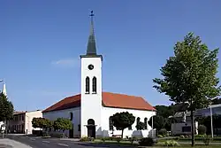 Die 1888 erbaute Große Schule wurde 1950 zur Pfarrkirche umgebaut. Der Turm wurde 1958 verändert.