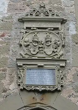 Die Achse der Kirche, etwa der des benachbarten Schlosses parallel, folgt dem Fallen des Hügels und ist nach Nordosten ausgerichtet, mit einer überdachten hölzernen Doppel-Emporentreppe von 1750 an der südwestlichen Bergseite und der Apsis im Erdgeschoss des unten viereckigen, darüber achteckigen Chorturms mit Kuppeldach im Nordosten. Südöstlich an den Turm schließt die Sakristei an, in der auch der Turmaufgang beginnt. Unfern der Apsis steht außen an der Kirchenmauer im Nordwesten ein niedriges Türmchen mit polygonalem Grundriss und Helm, über das früher eine weitere Empore im Vorderteil der Kirche zugänglich war; diese ist heute nicht mehr vorhanden und der Aufgang ist deshalb ebenso funktionslos wie die äußere Emporentreppe, weil inzwischen auch innen eine Treppe den Aufstieg zu dieser erlaubt. Zwei Eingänge liegen achsensymmetrisch gegenüber seitlich vorn am Schiff an der Nordwest- und Südostseite, zwei andere im hinteren Teil auf der Achse des Schiffs übereinander auf Emporenhöhe sowie – außen ebenerdig – darunter. Die Stiftertafel ist über dem Nordwesteingang angebracht.