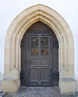Turm (Baukörper): Turm der Pfarrkirche WalddorfDas spätgotische Portal von 1500 an der WestseiteDas etwas schlichtere Portal an der Ostseite im Westen massiver Turm mit nahezu quadratischem Grundriss. Fast 2 Meter starkes Mauerwerk. Im Erdgeschoss flaches Tonnengewölbe, an der Südwand im Innern rundbogige, romanische Nische, wohl ehemaliges Tabernakel und eine weitere, etwas spätere Nische in der Nordwand. Außermittig (auf Grund der vorhandenen Nischen) kleine, tiefe und schmale gotische Schlitzfenster mit undeutlicher Spitzbogenform an Nord- und Südseite. An der Westseite spätgotisches Spitzbogenportal von 1500, das im Jahr 1700 von der Südseite des Langhauses hierher versetzt wurde. Im ersten Obergeschoss Auflager für ein hohes Tonnengewölbe (war 1867 noch vorhanden), dieses aber herausgebrochen (beim Umbau 1955?). An der Nordseite alter spitzbogiger Einstieg in den Turm, der früher nur mittels Leiter erreicht werden konnte, wohl 13. Jahrhundert. Die 12 cm starke, massive Eichentür (wohl Mitte 17. Jahrhundert) zeigt auf der Außenseite noch Spuren von Beilhieben aus Zeiten früherer Belagerungen. Im zweiten Obergeschoss alemannischer Fachwerkaufsatz mit Verblattungen und Mann-Figur aus der Zeit um 1500. Bis 1938 war der Turm einschließlich des Fachwerkaufsatzes verputzt.