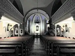Die Inneneinrichtung wurde schrittweise komplettiert: 1868 wurde der Taufstein angeschafft, der in gut lutherischer Weise vor dem Altar im Angesicht der Gemeinde aufgestellt ist. Später kam das Altargitter hinzu. 1873 wurden die Glasfenster im Altarraum erworben. Sie stellen Luther und Melanchthon dar, die im 19. Jahrhundert häufig als Paar in Kirchenräumen auftreten, sowie Petrus und Paulus. Alle Fenster sind mit zuordnenden Schriften versehen. Die Orgel stammt von der Orgelmakerij Reil aus dem Jahr 1989. Sie umfasst 22 Register auf zwei Manualen und Pedal.[1]