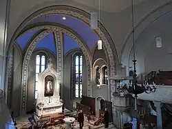 Der blaue Sternenhimmel im Altarraum ist typisch für die Zeit und die „erweckte / fromme“ Prägung der Gemeinde in der Erbauungszeit durch den damaligen Pfarrer Jakob Ernst Koch. Der nicht zuletzt durch die Farbgebung stimmungsvolle Raum soll auf das religiöse Gemüt und den Besucher wirken. Den neugotischen Altar ziert allein das Bild des Auferstandenen. Auf diese Weise sollte nicht nur das evangelische „Christus allein“ ausgedrückt, sondern auch in der Gemeinde die Liebe zum Heiland geweckt werden. Das im Altar hell gerahmte, 1881 angebrachte Christusbild bildet auch optisch das Zentrum des Raumes. Beim Altar findet sich die Inschrift: Alles und in allen Christus.