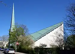 Zu dem Ensemble auf dem kleinen Grundstück gehören das Kirchengebäude und der 36 m hohe Turm sowie noch ein separater Bau mit Kindergarten, Pfarrbüro und Pfarrwohnung; Weitere Gemeinderäume befinden sich zudem in einem Gebäudeausleger hinter bzw. unterhalb des Kirchenraums. Neben der weißen Kirche steht frei der mit waagerechten Kupferplatten verkleidete grüne, spitz zulaufende und fensterlose Glockenturm. Dieser wird von Ortsansässigen auch gerne als „Zahnstocher Gottes“ bezeichnet.