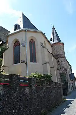 Der unverputzte Treppenturm am Chor stammt aus dem Jahr 1902 und hat einen achtseitigen Spitzhelm. Auch der unverputzte Vorbau an der Nordseite stammt aus dieser Zeit.[3] Die beiden Anbauten im Stil des Historismus heben sich von den verputzten älteren Baukörpern ab.