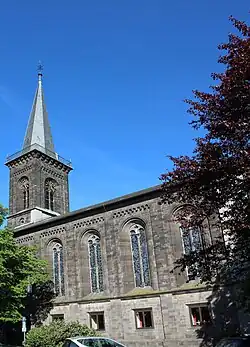 Die von Nordosten nach Südwesten orientierte, unverputzte Kirche ist im Stadtzentrum aus Londorfer Basaltlava errichtet. Ausgehend von der Neuromanik sollte ein eigener Baustil begründet werden.[16] Die Langseiten werden durch Lisenen, die oben in Rundbogenfriese übergehen, gegliedert und durch ein umlaufendes Kaffgesims in ein Drittel der Wandhöhe geteilt.[17] In den oberen Feldern sind große rundbogige, zweigeteilte Fenster gereiht, in der Sockelzone sind querrechteckige Fenster eingelassen. Beide Giebelseiten haben Ecklisenen, die in ein Rundbogenfries übergehen. Die Nordostseite hat zu beiden Seiten des Turms ein zweibahniges Maßwerkfenster mit Vierpass.