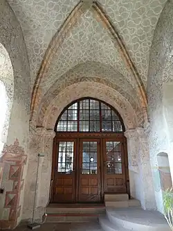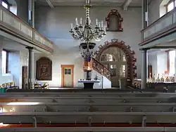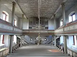 Der Innenraum wird von einer Flachdecke abgeschlossen, die von drei Unterzügen und geometrischem Stuckwerk gegliedert wird.