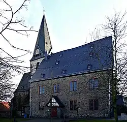 Ältester Teil ist der Turm, der sich zwischen Chor und Schiff auf annähernd quadratischem Grundriss erhebt. Im unteren Teil ist das Mauerwerk 1,5 Meter stark. Das südliche Priesterportal weist auf die Funktion als Chorturm mit Altarraum hin.[6] Das Rundbogenportal in einer Rundbogennische hat zwei romanische Ecksäulen mit Würfelkapitell, auf der Innenseite einen geraden Sturz und die romanischen Eisenbeschläge an den Flügeln.[18] Östlich befindet sich ein zweiteiliges rechteckiges Fenster, das vor 1400 vergrößert und um 1600 mit Sandsteingewänden ausgestattet wurde. Im Turmraum ruht das einjochige Kreuzrippengewölbe auf Eckkonsolen und mündet in einen quadratischen Schlussstein. Gesimse gliedern den Turm in drei Geschosse unterschiedlicher Höhe.[19] Der untere Teil hat an der Nordseite ein schmales romanisches Rundbogenfenster, das zur Sakristei hin zugemauert ist. Die beiden Obergeschosse sind von der Frühgotik geprägt und haben je vier gekuppelte Spitzbogenfenster in spitzbogigen Nischen. Aufgrund des Anbaus von Chor und Schiff sind die Fenster an der Ost- und Westseite zugemauert oder zerstört, aber noch nachweisbar. Abgeschlossen wird der Turm von einem verschieferten Helm, dessen vier hölzerne Dreieckgiebel in einen achtseitigen Spitzhelm übergehen. Das Dachwerk von Treppen- und Glockenturm stammt aus mittelalterlicher Zeit.[20]