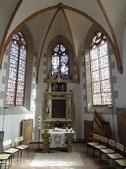 Der spätgotische Chor mit unregelmäßigem 3/8-Schluss ist mit einem neugotischen Rippengewölbe gedeckt, das seit 1907 eine flache Holzschalung ersetzt. Die Strebepfeiler aus der Erbauungszeit weisen darauf hin, dass der Chor ursprünglich über ein Gewölbe verfügte. Die großen, zweigeteilten Spitzbogenfenster sind alt, das Maßwerk mit Fischblasen und Rundbögen ist teilweise erneuert. Von der ursprünglichen halbrunden Apsis ist an alter Stelle der mit Blättern verzierte Knauf erhalten, in dem das Kegeldach einst endete.[21]
