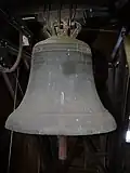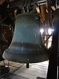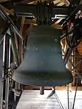 Der Turm beherbergt ein Dreiergeläut. Die größte Glocke wird im Volksmund als „Dicke Susanne“ (vermutlich verlesen von Sub anno) bezeichnet.[30] Sie wird dem Kölner Gießer Delman Borger tzu hogen zugeschrieben, der sich erst in Haiger, dann in Hungen niederließ und teilweise mit Johann Bruwiller zusammen goss. Der Legende nach wurde sie während des Dreißigjährigen Krieges vergraben, war nach Kriegsende aber nicht mehr auffindbar, bis ein weidendes Schwein die Glocke wieder zutage förderte. Bei der Inschrift dienen kleine Rosetten als Worttrenner. Eine vierte Glocke von 1707 soll 1917 an die Rüstungsindustrie abgeliefert worden sein, war aber schon in einer Inventur von 1884 nicht vorhanden.[31] Im Zweiten Weltkrieg wurde die zweite Glocke von 1697 abgeliefert, entging aber dem Einschmelzen und gelangte von einer Hamburger Glockensammelstelle wieder zurück nach Hungen.[32] Die älteste Glocke mit den Namen der vier Evangelisten als Inschrift hat einen sehr modernen Teiltonaufbau und dient als Vaterunserglocke.