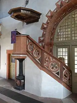 Die sechseckige steinerne Kanzel von 1606 auf der Mittelachse des Schiffes hat einen hölzernen, polygonalen Schalldeckel, auf den der Bibelvers aus Mt 24,35  gemalt ist: „Himmel und Erde werden vergehen, aber meine Worte vergehen nicht“. Stilistisch steht sie am Übergang von der Gotik zur Renaissance. Die steinerne Brüstung des Kanzelaufgangs weist als Maßwerk Kreise mit Vierpässen auf. Der Altartisch aus weiß-geädertem schwarzem Marmor auf geschweiftem Fuß wurde um 1830 geschaffen. Die dreiseitige Empore wurde 1874 in ähnlicher Konstruktion wie die alte Empore eingebaut.[27] Sie ruht auf toskanischen Steinsäulen, die oben in viereckige, die Unterzüge stützende Holzpfosten übergehen. Das neugotische Gestühl des Fürstenstuhls stammt ebenfalls von dieser Innenrenovierung.[22] Das hölzerne Epitaph für Graf Moritz fand an der Ostwand des Kirchenschiffs neben der Tür zur Sakristei Platz. Zwei Kronleuchter stammen aus dem 19. Jahrhundert und unterstreichen die axiale Ausrichtung des Schiffs. Der tschechische Maler Jiri Vlach schuf das abstrakte zeitgenössische Ölgemälde an der Südwand mit dem Titel Christusoffenbarung. Das Geschenk der örtlichen katholischen Gemeinde ist das einzige Gemälde in der reformierten Predigtkirche.[25]