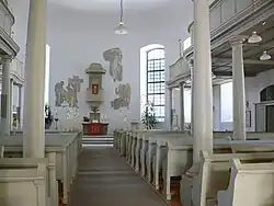 Der ovale Innenraum wurde bei der Sanierung von 1986–1988 aufgrund von Farbresten in der barocken Farbgebung rekonstruiert. Die Farben Weiß, Grau und Gold bestimmen den Raum und verleihen ihm sein vornehmes, fast schon klassizistisches Gepräge. Als evangelischer Predigtsaal ist der Innenraum auf die hinter dem Altar an der Wand angebrachte Kanzel ausgerichtet. Diese stammt aus dem 18. Jahrhundert und ist aus Holz gefertigt, der Altar und der Taufstein (beide aus dem Jahr 1954) wurden aus Dieterswiler Sandstein gehauen. Das bronzene Altarkruzifix stammt von Jakob Brüllmann aus dem Jahr 1929.[13]