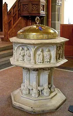 - Um 1500 wurde der achteckige Taufstein mit gedrehten Säulchen und unter Arkaden paarweisen Apostelreliefs geschaffen.