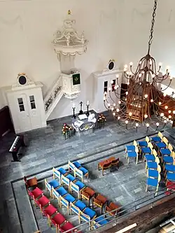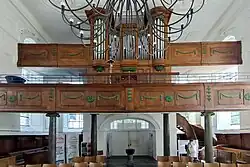 An der Ostseite finden sich zwei Holzemporen und an der Westseite ein zweiteiliger, kunstvoll geschnitzter Kanzelaltar.