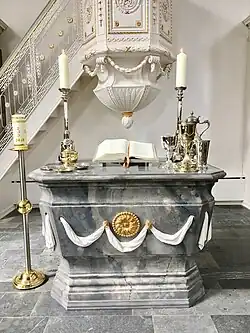 Vor der Kanzel steht der 1977 abgebaute und bis 2014 auf dem Speicher in Teilen eingelagerte bauzeitliche Louis-seize Altar von 1789 aus Eichenholz. Im Zuge der jahrzehntelangen Einlagerung waren Mensa und die geschnitzten, feinen Applikationen verschwunden. Auf Beschluss des Presbyteriums vom 3. Juli 2014 wurde er nach im Archiv der Kirchengemeinde vorhandenen Photographien und Beschreibungen des Originalzustandes ergänzt, restauriert und am 23. August 2014 wieder aufgestellt. Er stellt mit Kanzel und Logen eine in dieser Form einzigartige Interpretation des lutherischen Kanzelaltars dar.