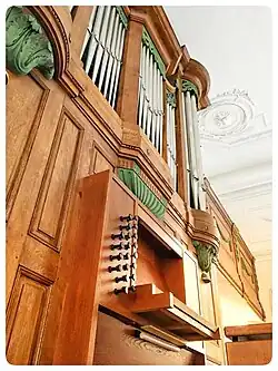 Diese Orgel wurde 1981 durch ein wiederum neues, viertes Instrument ersetzt. Es handelt sich um ein Werk des Orgelbauers Heinz Wilbrand aus Übach-Palenberg.[55] Wegen der nötig gewordenen statischen Ertüchtigung der Orgelempore musste diese Orgel im Januar 2013 ausgebaut werden, nachdem sie bereits seit der Teilschließung der Kirche im Februar 2010 nicht mehr gespielt werden konnte.