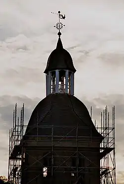 - Über schmale Treppen ist zu besonderen Gelegenheiten das Uhrwerk von 1926 zu erreichen, das zwei Mal wöchentlich von Hand aufgezogen wird (zusammen 680 Kurbelumdrehungen). Durch das Uhrwerk werden auch die Glocken für den Stundenschlag und Viertelschlag mit einem Hammer angeschlagen.[27]