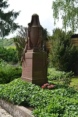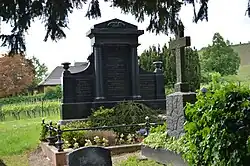 Stephan Sandmann | Grabmal Stephan Sandmann († 1863): Rotsandsteinstele, im kleeblattförmigen oberen Abschluss Cherubim. Sandmann war Bürgermeister von Nierstein. |