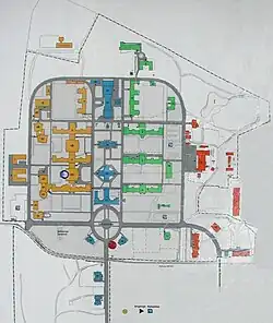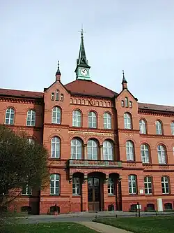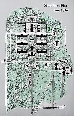 Auf dem Gelände von 95 Hektar wurden 1889–1892 die ersten Gebäude errichtet. Die Lageanordnung erfolgte streng symmetrisch: Das dreigeschossige Hauptgebäude mit zentralen Funktionen steht an einem Hauptweg in Ost-West-Richtung ausgerichtet, in Verlängerung seiner kurzen Seitenflügel sind Wege in Nord-Süd-Richtung angelegt, von denen je drei zweigeschossige längliche Krankenpavillons, ebenfalls mit einer baulichen Mittelbetonung, abgehen. Alle Häuser sind im Neorenaissance-Stil ausgeführt und mit gelben und roten Klinkern verblendet. Kritiker nannten den Baukomplex zur Zeit der Fertigstellung Kasernenbaukunst.[5] Alle Bauwerke sind in Grünanlagen eingebettet, Bäume wurden gepflanzt und sogar ein Teich angelegt. Ab 1986 konnten schrittweise alle Gebäude saniert werden.[9]