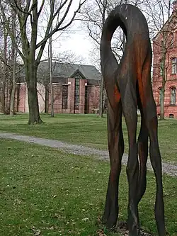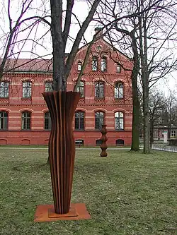Eisenkörper - Auf einer Rasenfläche zwischen dem Hauptweg und Haus 1 sind drei rotationssymmetrische Körper aus Corten verteilt, Objekte aus der Serie Kavex des Künstlers Herbert Mehler, die im Januar 2008 hier aufgestellt wurden. – Eine große Keule hängt in etwa 3 Meter Höhe zwischen zwei Bäumen und ein hölzernes abstraktes Werk (die jedoch beide von anderen Künstlern stammen), vervollständigt die Kunstgruppe.
