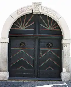 Der zweigeschossige Bau mit vier Fensterachsen besitzt an der Straßenseite einen Torbogen mit folgender Inschrift: