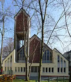 Nach der Wahl des ersten Gemeindekirchenrates im Jahr 1955 beschloss dieser den Neubau einer Kirche. Die Grundsteinlegung der Kirche am Hausotterplatz konnte am 11. Juli 1955 stattfinden. Das Richtfest wurde am 28. November des gleichen Jahres gefeiert. Am 9. Dezember 1956 erfolgte die Einweihung mit dem Spruch „Siehe da, die Hütte Gottes bei den Menschen“.