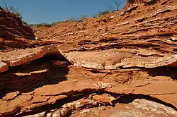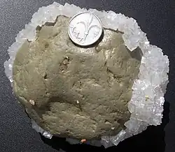 - Zuletzt (ab einer Konzentration auf mehr als das 100-fache, konzentriert in weniger als 1 % der ursprünglichen Wassermenge) fallen die Kalium- und Magnesiumsalze aus (u. a. Carnallit, Sylvin, Kainit). Diese werden auch Kalisalze, Edelsalze oder, weil sie vor der Entdeckung, dass sie hervorragend für die Düngemittelherstellung geeignet sind, nicht gefördert, sondern auf die Abraumhalde gekippt wurden, Abraumsalze genannt.[1] Die entsprechenden Gesteine heißen, je nach dominierendem Edelsalzmineral, u. a. Sylvinit oder Carnallitit und werden bergmännisch unter der Bezeichnung Kalisalz zusammengefasst.