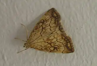 Die Falter erreichen eine Flügelspannweite von 24 bis 26 Millimetern. Die Grundfarbe der Vorderflügel ist ein glänzendes Gelb mit braunroten Querlinien, Stigmata und Adern, die ein Netzmuster erzeugen. Die Hinterflügel sind schillernd weiß mit einigen, unvollständigen braunen Linien.