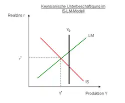 Hier geht man von der Starrheit der Nominallöhne, von unzureichender Güternachfrage (Z) und von einer Unterbeschäftigung am Arbeitsmarkt aus. Fraglich ist, ob die Investitionstätigkeit abhängig vom Zins ist. Man vermutet, dass das unter bestimmten Umständen eine Auswirkung auf das Gleichgewichtseinkommen, als auch auf die Beschäftigung hat.