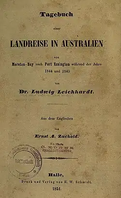 - ↑ Ludwig Leichhardt: Tagebuch einer Landreise in Australien von Moreton Bay nach Port Essington während der Jahre 1844 und 1845 Übersetzer aus dem Englischen: Ernst Amandus Zuchold. Verlag H. W. Schmidt, Halle 1851