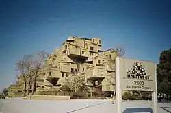 Die Bauarbeiten zur Weltausstellung in Montreal begannen am 13. August 1963 mit dem offiziellen Spatenstich durch Premierminister Lester Pearson.[17] Chefarchitekt des Bauvorhabens war Édouard Fiset. In einer ersten Phase wurde die Île Sainte-Hélène mit 25 Millionen Tonnen Erde erweitert, um damit die Ausgrabungsarbeiten für eine eigene U-Bahn-Linie der Metro Montreal zu ermöglichen. Neben der Erweiterung der bestehenden Insel galt der Hauptteil der Arbeiten in der Erstellung der künstlichen Insel Île Notre-Dame. Durch diese Maßnahme konnten 120 Hektar Neuland gewonnen werden. Vor den Bauarbeiten zur Expo war die Île Sainte-Hélène flächenmäßig nur halb so groß und die Île Notre-Dame ein Wattgebiet.[18] Der dritte Teil des Geländes, der Mackay Pier am Hafen, befand sich zu Beginn der Bauarbeiten noch nicht im Eigentum der Weltausstellungsgesellschaft. Am 20. Juni 1964 übertrug die Stadt Montreal dieses Landstück an die Gesellschaft, so dass die notwendigen Umbau- und Erweiterungsmaßnahmen durchgeführt werden konnten. Die Halbinsel wurde in Cité du Havre umbenannt. Hier errichtete man neben einem Expo-Theater, einem Stadion und Verwaltungsgebäuden auch die Wohnanlage Habitat 67. Die Wohneinheiten bestanden aus vorgefertigten Betonboxen in Form eines Quaders mit den Maßen 5 × 11 × 3 Meter. Ursprünglich sollten 1350 dieser Teile für rund 1000 Wohneinheiten entstehen. Aus Kostengründen entschied man sich dazu, nur 354 Raumelemente mit 158 Wohneinheiten zu bauen.[19]