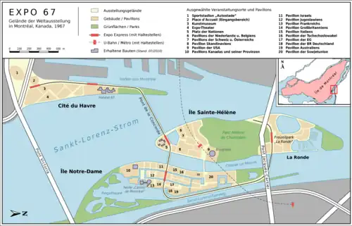Die Expo 67 fand auf der Halbinsel Cité du Havre, früher als Mackay Pier bezeichnet, und den im Sankt-Lorenz-Strom gelegenen Inseln Sainte-Hélène und Notre-Dame statt. Das 365 Hektar große Gelände befindet sich in der Nähe des Montrealer Hafens und der Altstadt, womit es zentral gelegen ist. Beide Inseln sind sowohl untereinander als auch mit beiden Uferteilen Montreals über Brücken verbunden. Vom Parc de la Cité du Havre führt die Pont de la Concorde (engl.: Concordia Bridge) zur Südspitze der Île Sainte-Hélène, die am 21. Oktober 1965 eingeweiht[31] wurde. Die 690 Meter lange Balkenbrücke ermöglichte der Expo 67 den schnellsten Zugang zum Haupteingang am Place d’accueil. Am östlichen Ufer der Insel ändert die Brücke ihre Richtung um rund 30 Grad in südöstliche Richtung und verbindet als Pont des Îles damit auch die zweite Insel Notre-Dame.